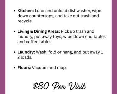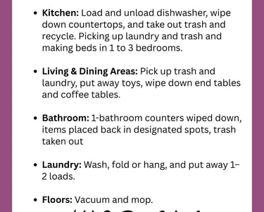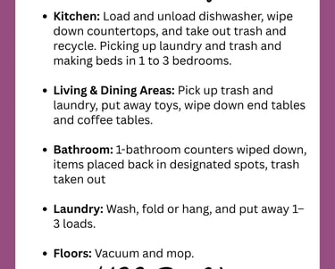 If you find yourself needing a helping hand with your kitchen, living room, or even the kid's playroom or area, look no further! The Home Reset is designed to help you come home to a stress-free home so you can spend your time doing what you love and want to do the most.